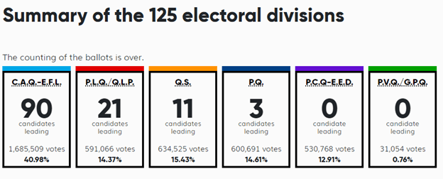 Безоговорочные лидеры в прошлом: Либеральная и Квебекская партии на этих выборах были фактически разгромлены. При чём если в случае Либеральной партии причины более или менее понятны: невнятное лидерство и спорная программа, составленная людьми, видимо, утратившими связь с реальностью. Тогда как достаточно печально видеть, что уважаемая и популярная в прошлом Квебекская партия, несмотря на молодого и харизматичного лидера, так выхватила от CAQ. Так, либералы потеряли 10 мест в парламенте, почти потеряв для себя остров Лаваль, а сепаратисты – 7.